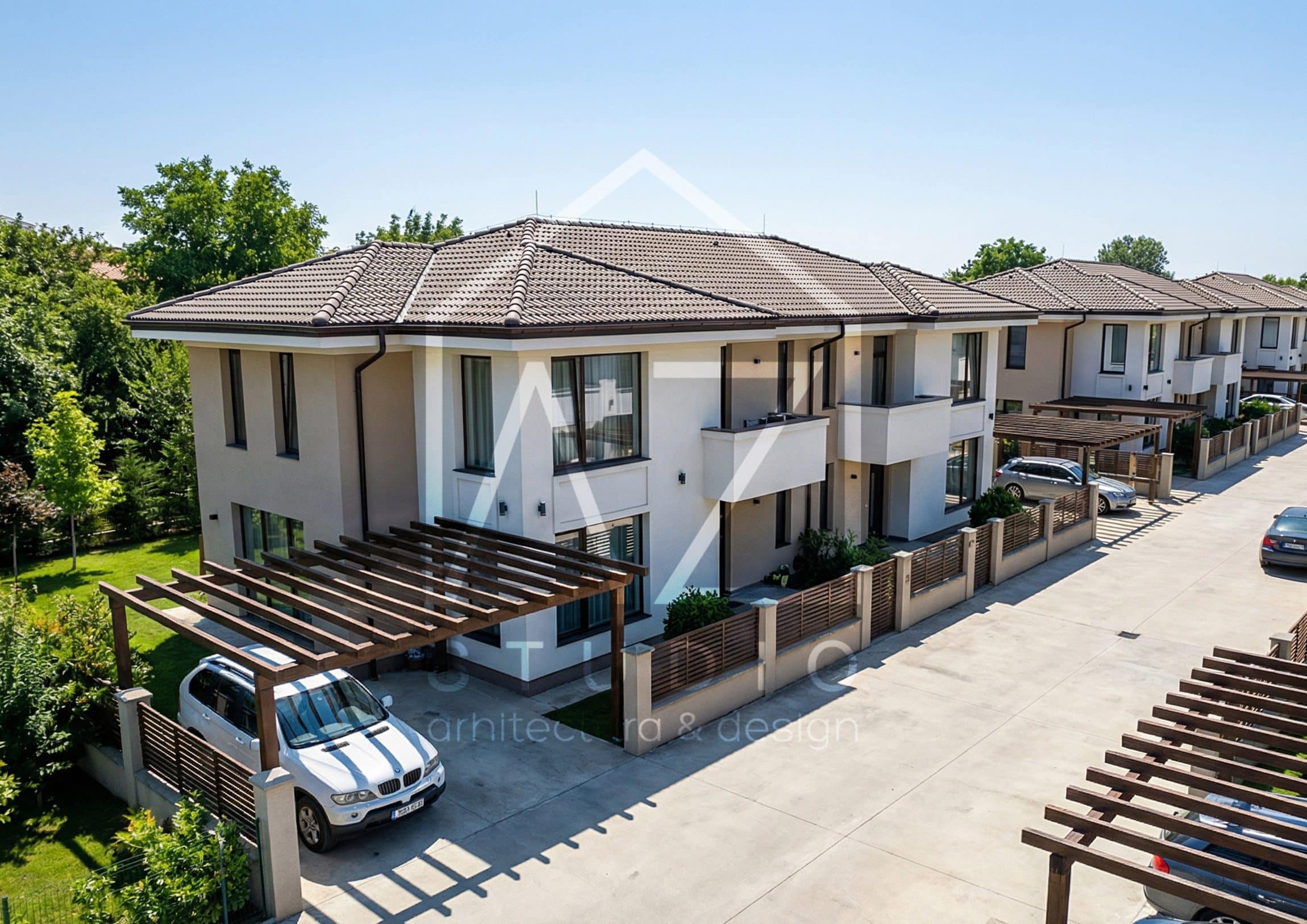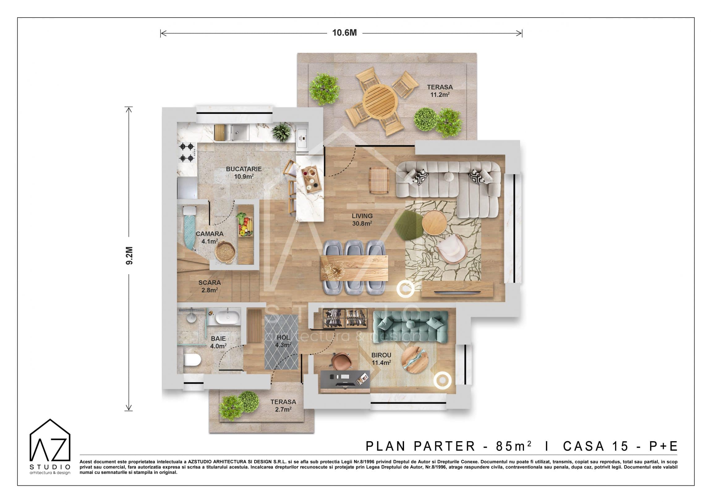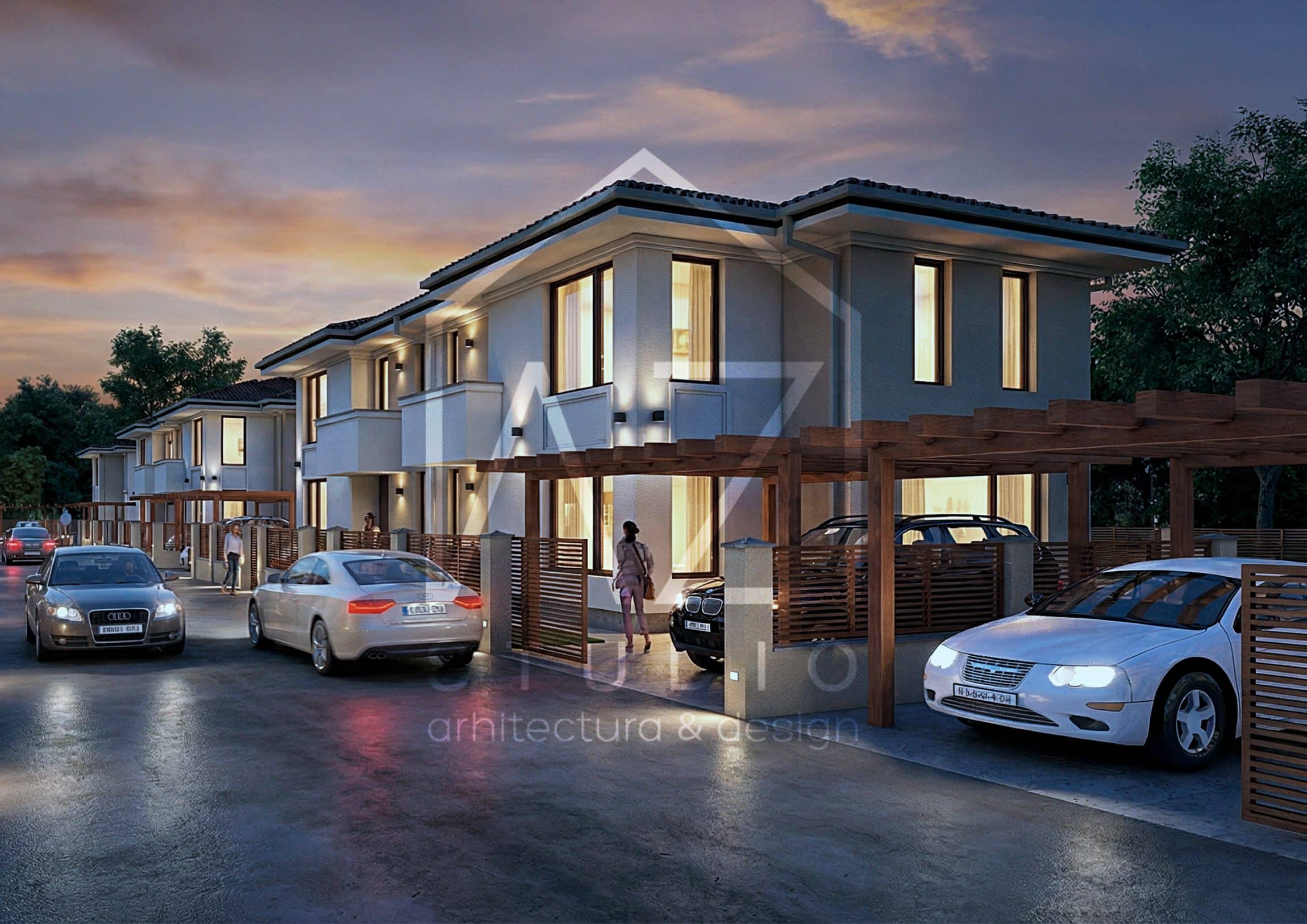 Suprafata construita a parterului este generoasa si eficienta. Cuprinde zona de zi a locuintei, compusa din: living si bucatarie deschisa, cu insula, precum si o camara, un birou si o baie de oaspeti. La etaj se afla zona de noapte a locuintei. Cei 67mp utili gazduiesc dormitoarele copiilor, cu acces la o baie comuna si dormitorul matrimonial, dotat cu dresing si baie proprie. Cele doua terase de la parter sunt acoperite de balcoanele corespondente de la etaj. Eleganta, eficienta si acuratetea arhitecturii exterioare fac acest proiect potrivit atat dezvoltarilor imobiliare rezidentiale cat si proiectelor individuale de resedinte private.