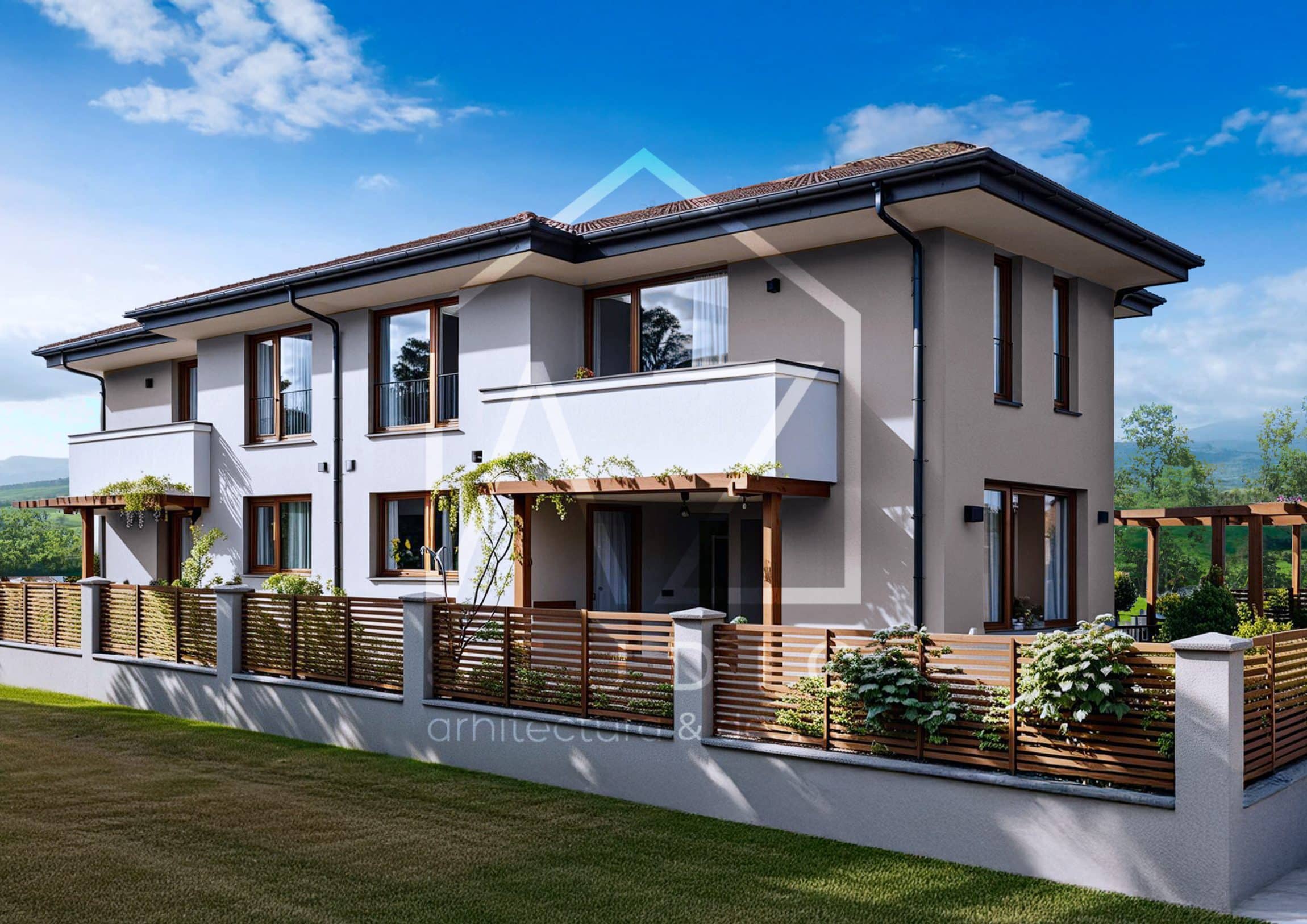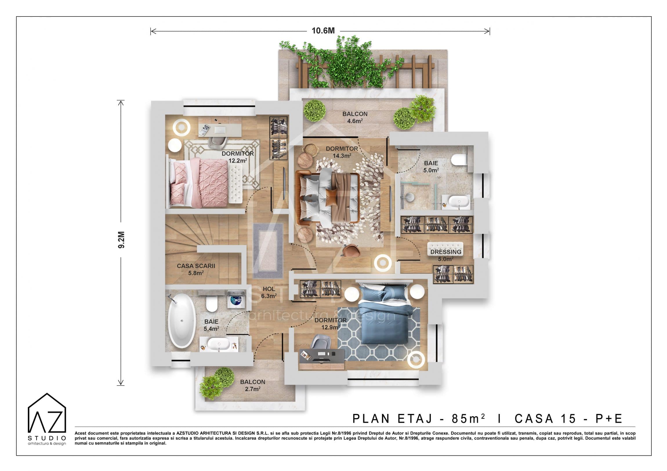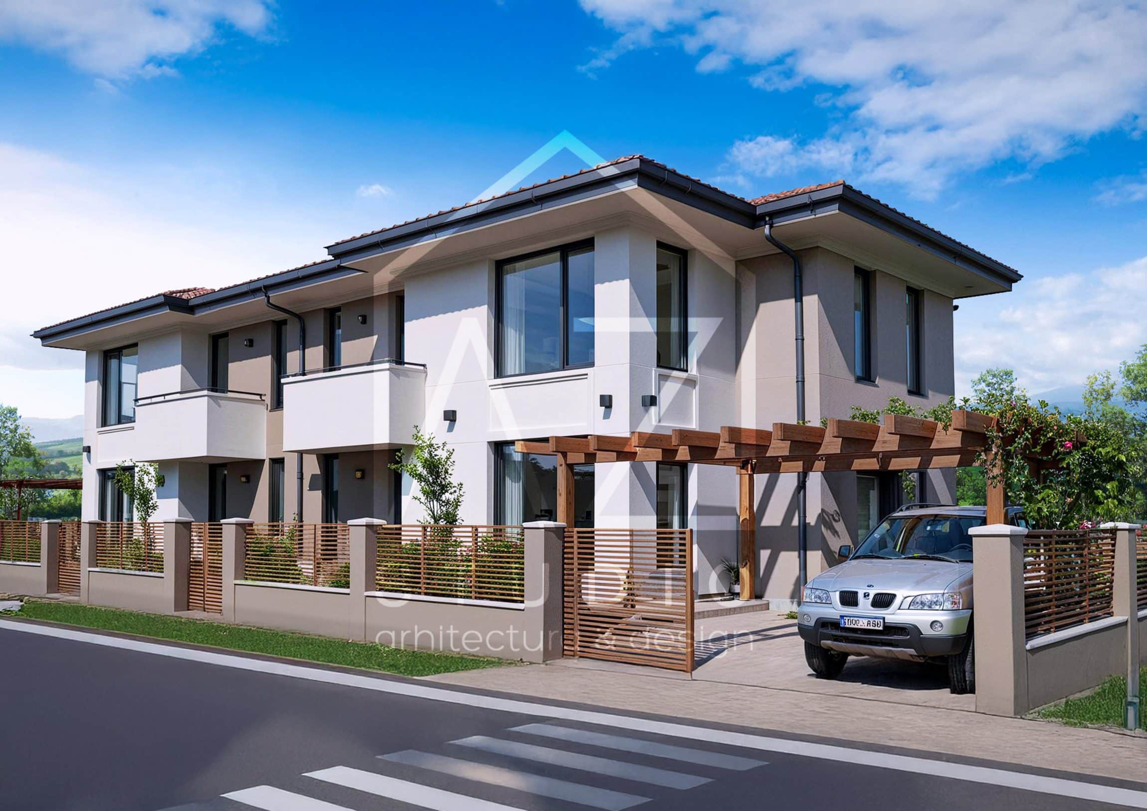 Casa eleganta cu etaj tip duplex sau individuala 170mp are un volum echilibrat si compact. Poate fi construita atat ca locuinta individuala cat si cuplata in oglinda cu inca o unitate similara, in regim duplex. Simplitatea si coerenta arhitecturala ii dau o nota eleganta. Planul este compus din doua niveluri in suprafata construita egala de cate 85mp. Suprafata construita desfasurata totala pentru o unitate este de 170mp. Suprafata utila interioara pentru fiecare nivel este de 68.5mp si 67mp, insumand un total de 135,5mp.
